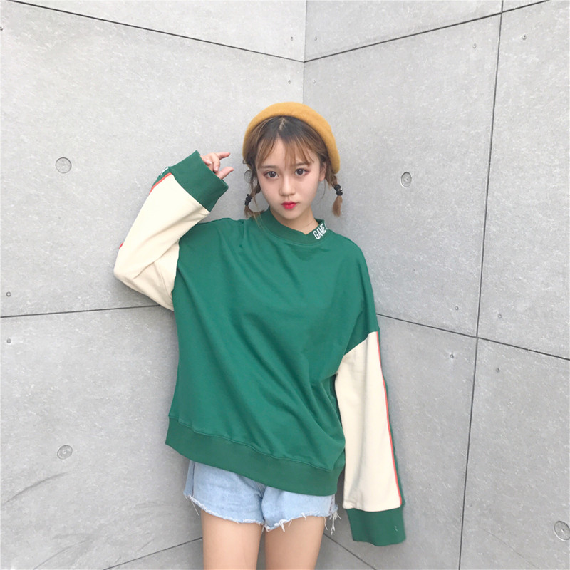 Autumn women Korean stitching loose hedge embroidery letters wild long-sleeved sweater