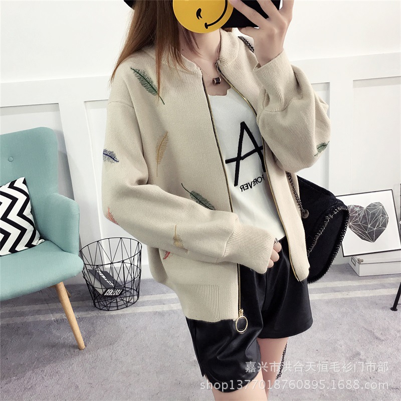 Autumn and winter Korean new women’s embroidery color leaf knit cardigan zipper baseball sweater