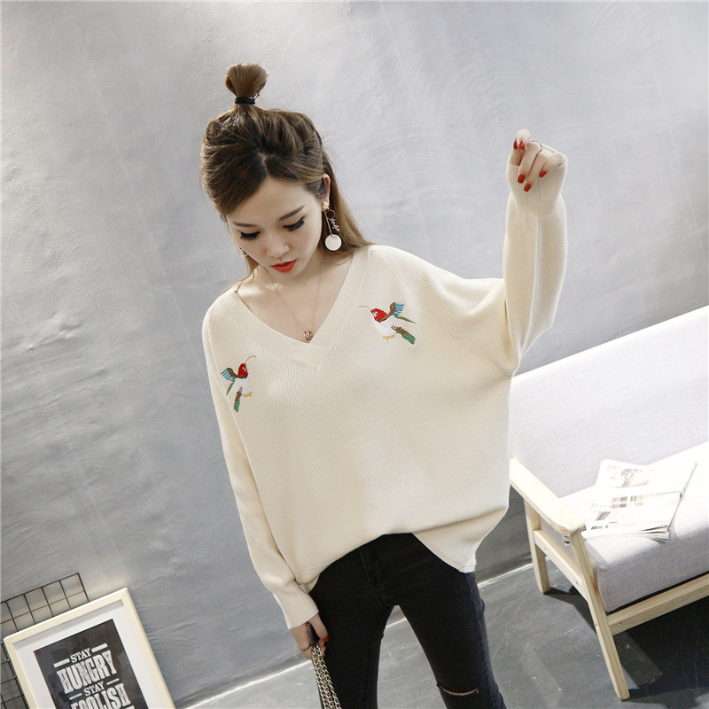 Autumn new knitted women embroidered sets of sweaters printed bird