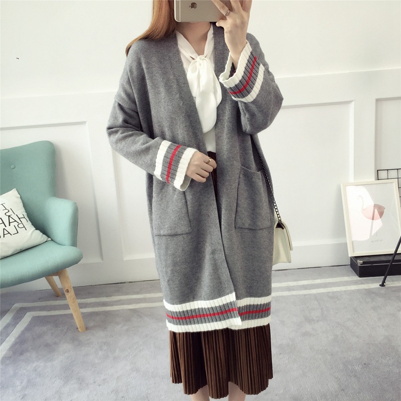 Autumn and winter women’s new thin striped Korean loose long paragraph pocket cardigan sweater