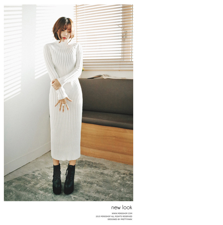 Autumn and winter new women’s striped knit long section of semi-high collar slim knees package hip skirt
