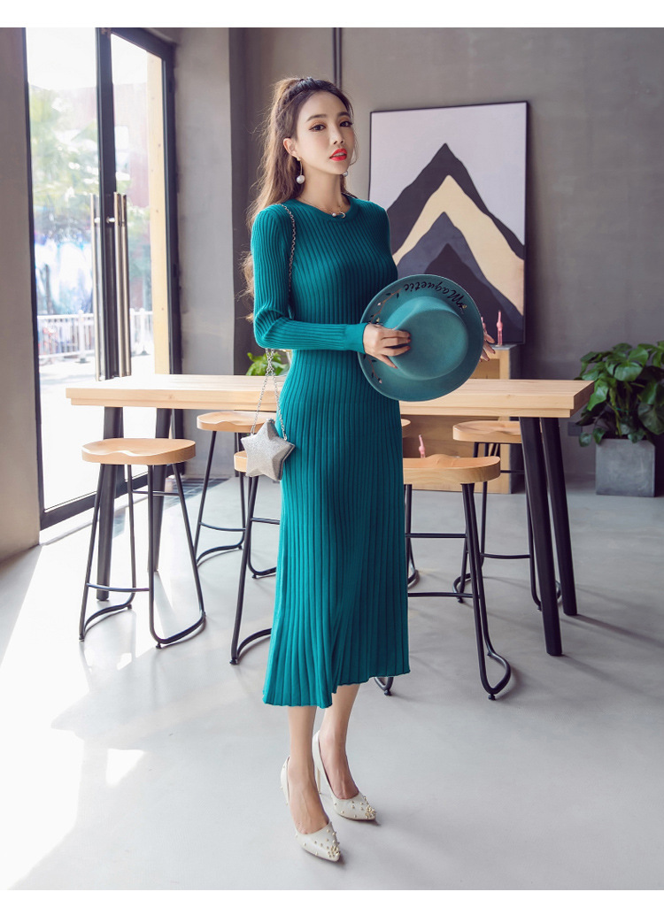 Autumn and winter new Korean women’s knit low self-cultivation round neck long-sleeved waist-covered core yarn dress