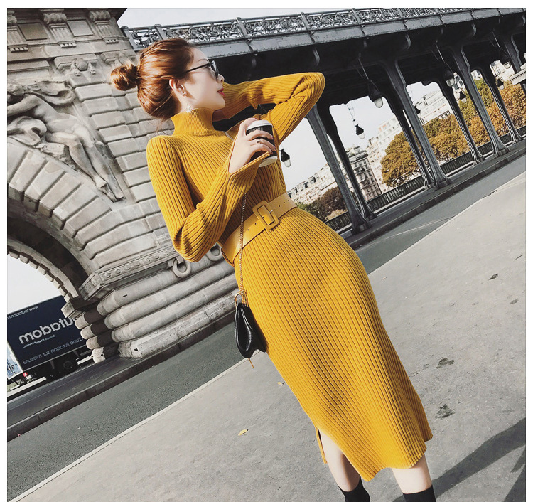 Autumn and winter long section knit women Slim knee step back sweater dress