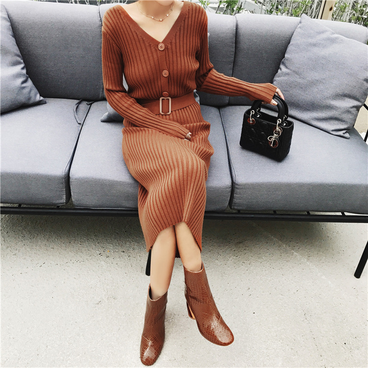 Autumn and winter new temperament Korean V-neck caramel Slim waist knit dress