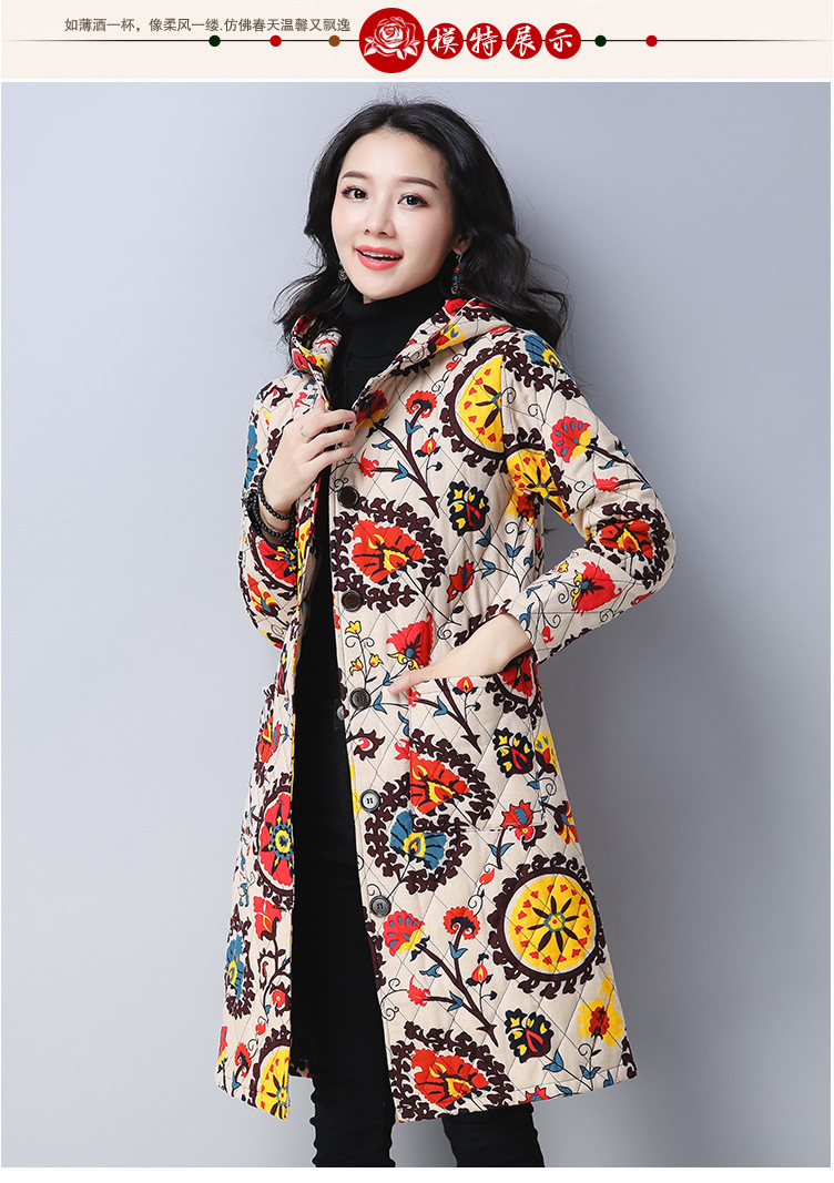 Winter new retro cotton padded Slim printing hooded long long-sleeved cotton padded jacket