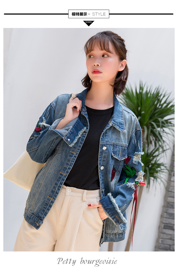 New women’s autumn hole loose flowers embroidery denim jacket