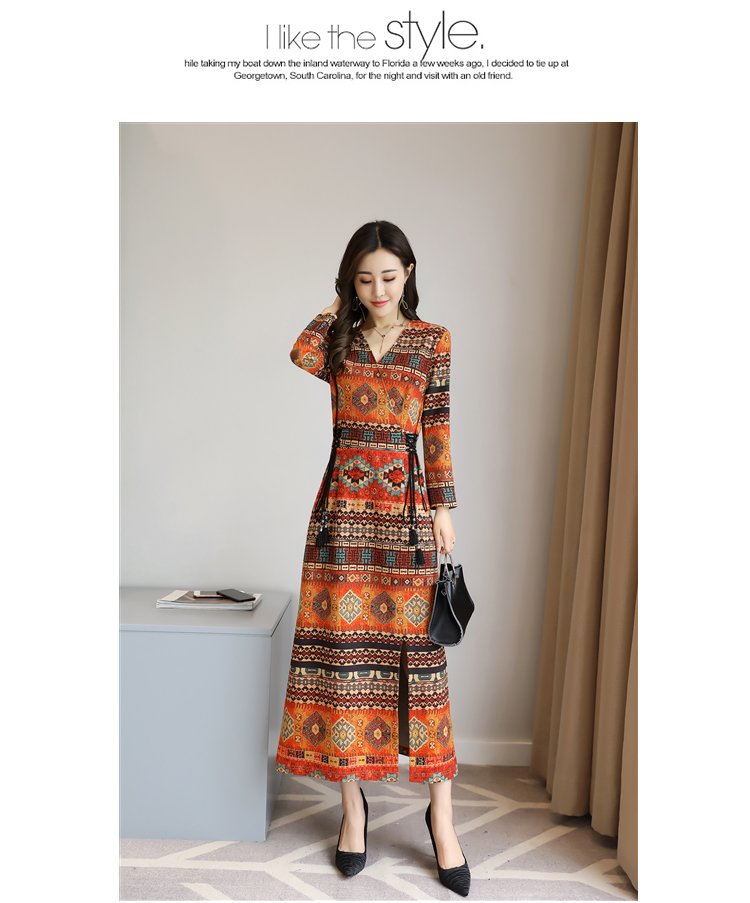Autumn women long sleeve new waist thin V-neck skirt split dress