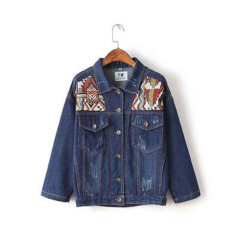 Autumn and winter new ethnic style women hit color paste loose denim cardigan jacket