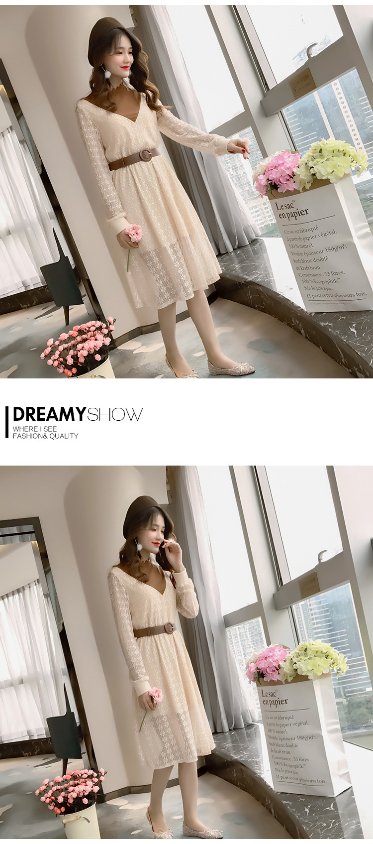 Spring Sequined lace collar wild lace Slim waist back skirt fake two peice dress