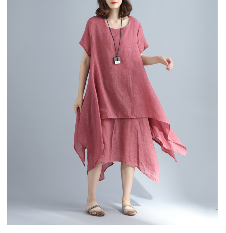 Cotton One-piece Solid color fake two piece long skirt round neck dress