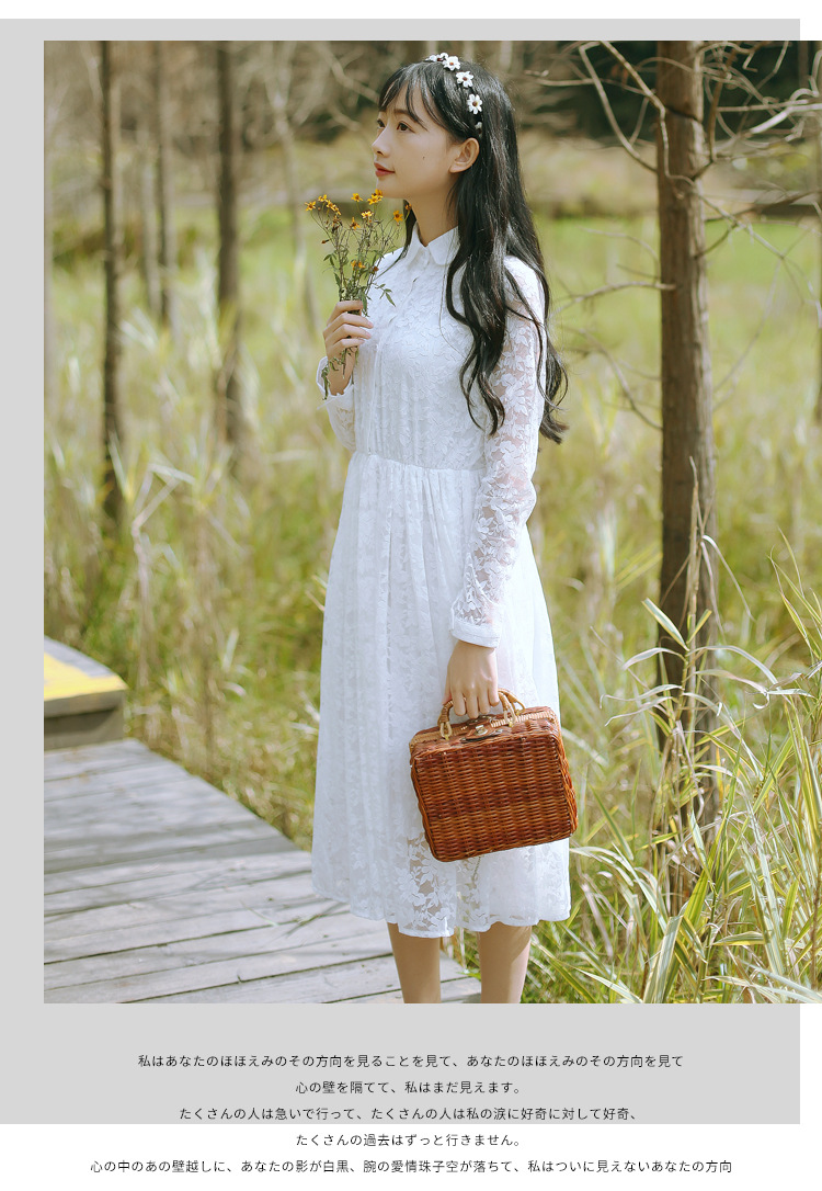 Spring new Korean lapel multiple buckle hollow lace flower pleated dress