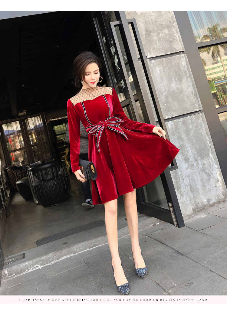 Spring ladies temperament small incense splicing tie bow gold velvet dress