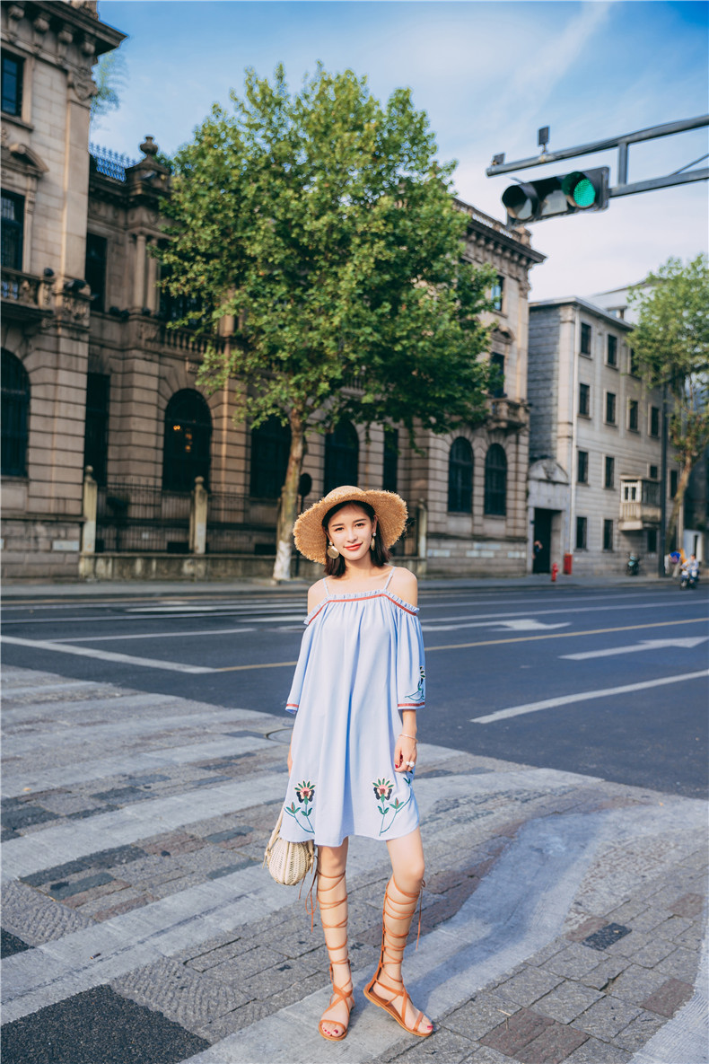 Retro embroidery flowers slip shoulder strap skirt dress