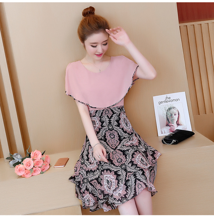 New loose short-sleeved summer round neck color chiffon stitching cover belly dress