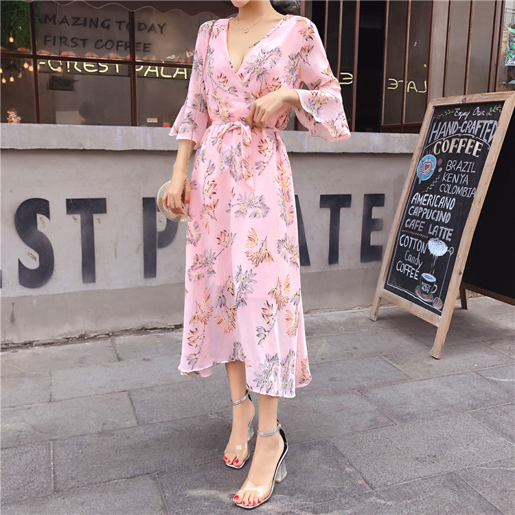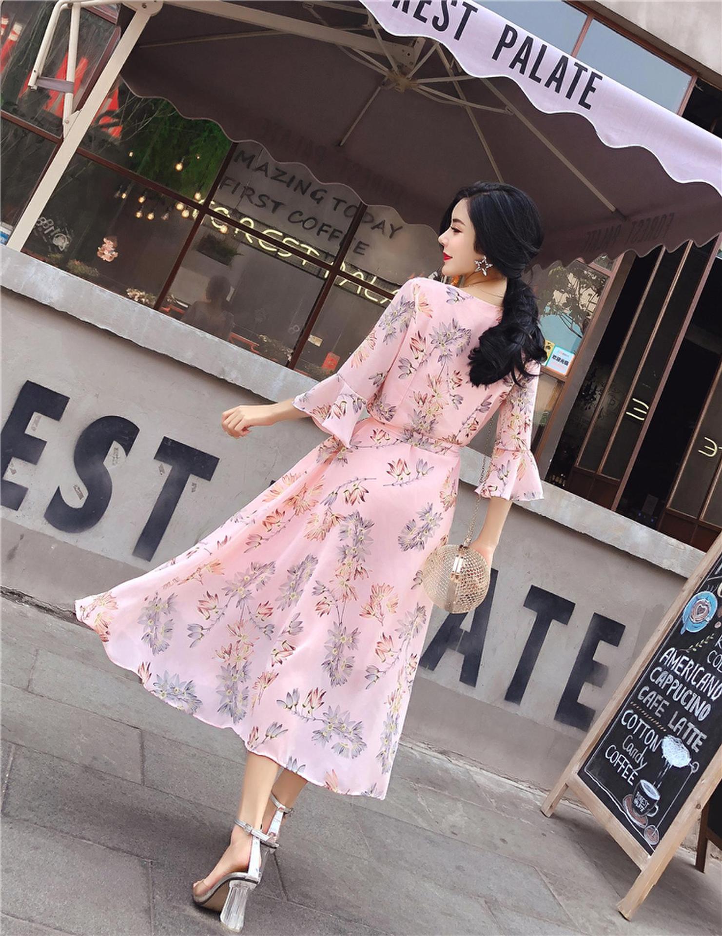 Summer new style belt waist V-neck trumpet sleeves color chiffon dress