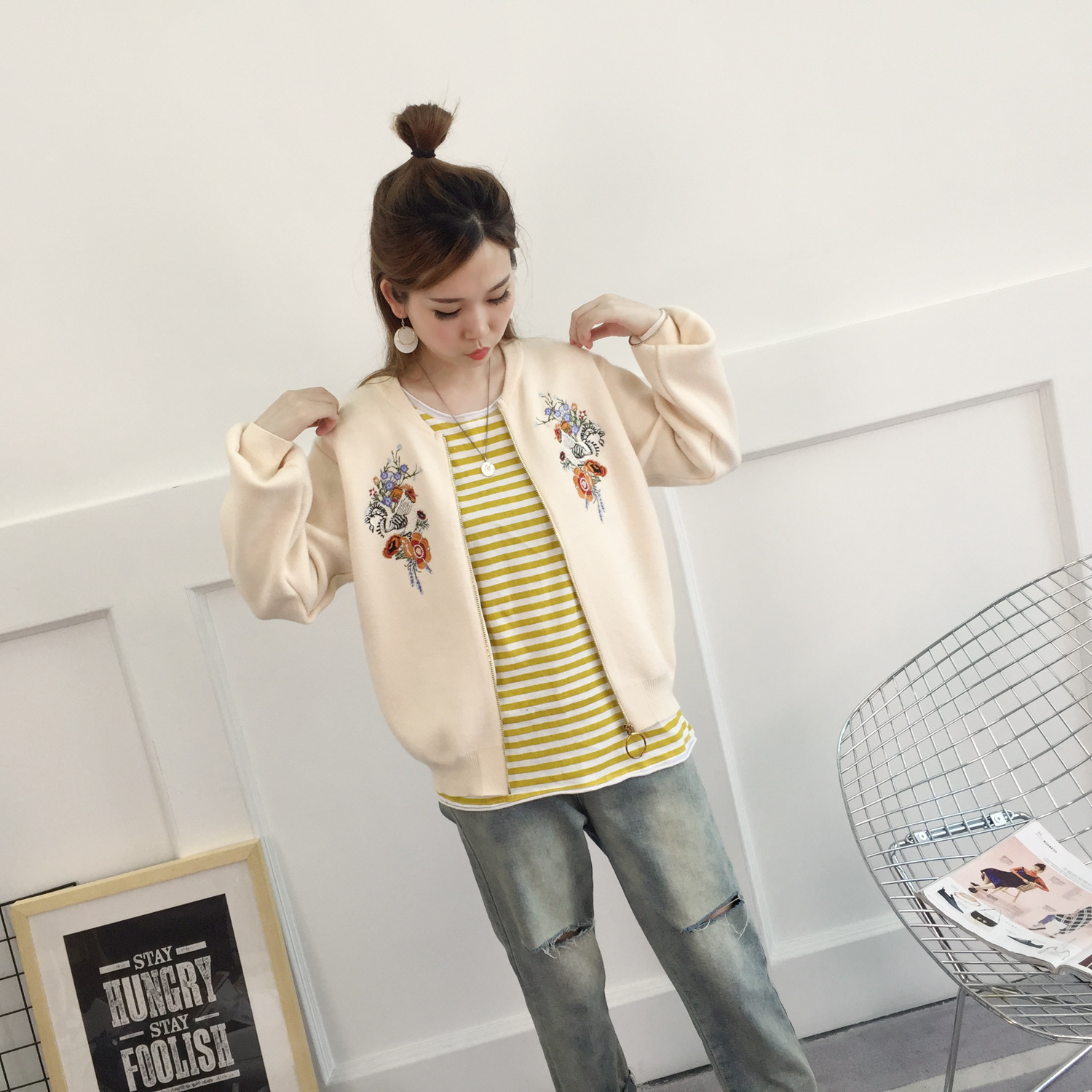 Autumn and winter new women knitted cardigan loose color fight students wild embroidery sweater