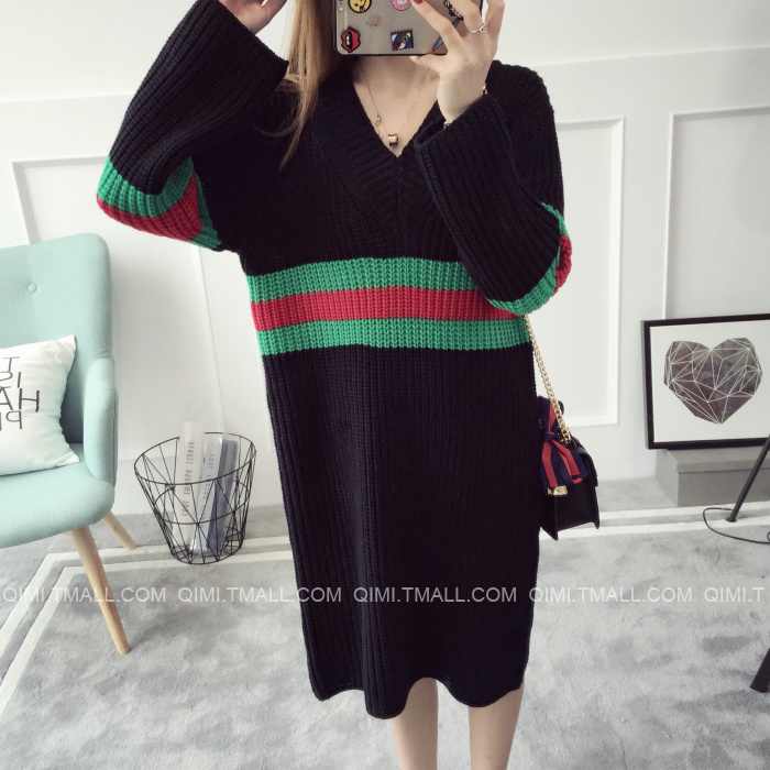 Autumn and winter long new Korean striped V-collar sweater