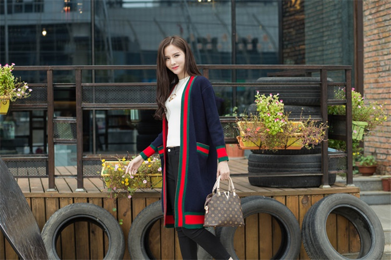 Spring new women’s cardigan coat long fight color striped thick sweater