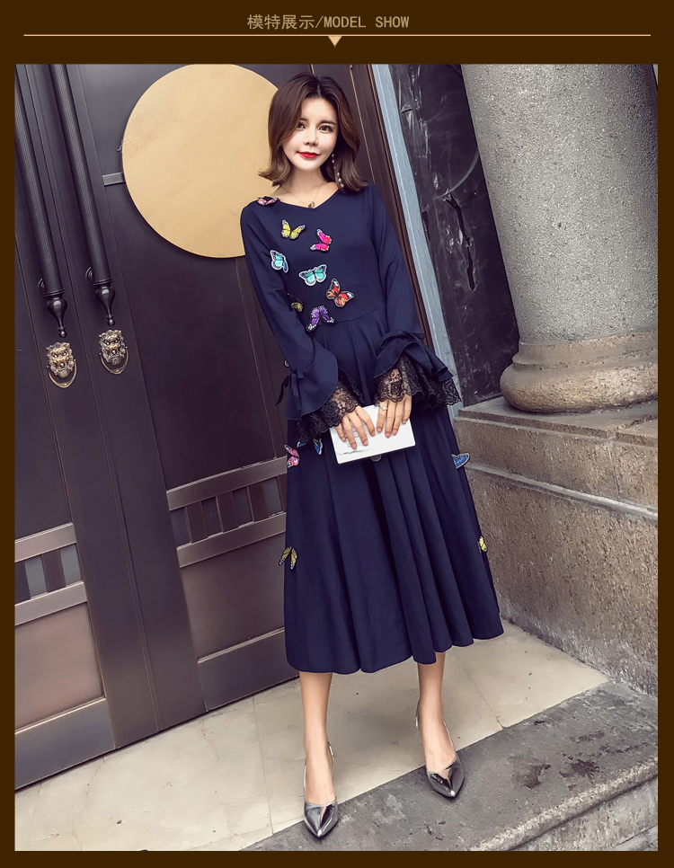 Autumn new long section of embroidery lace stitching high waist dress